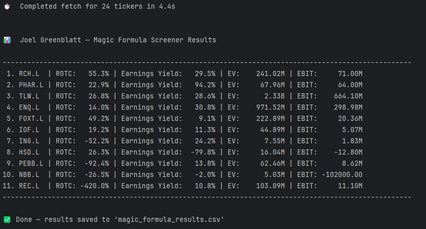 The Greenblatt Screener is a small, practical implementation of Joel Greenblatt’s Magic Formula investing framework.